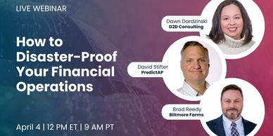Discover how automation can safeguard your business during crises in D2D Consulting and PredictAP’s exclusive webinar on April 4. Learn from Brad Reedy of Biltmore Farms as he shares real-life strategies for maintaining financial operations during disasters.